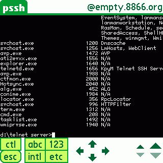 一个仿真终端软件,下面是telnet我的pc的界面。恩,还用这个整蛊过宿舍里的哥们,我在回家的火车上连了一下主机,发现有人玩war3,然后偶等一局快over的时候,使用了taskkill。。,等我回到学校的时候我问,最近两天魔兽是不是经常蹦,他们说是啊,不知怎么回事~然后偶就跟他们炫这个东东